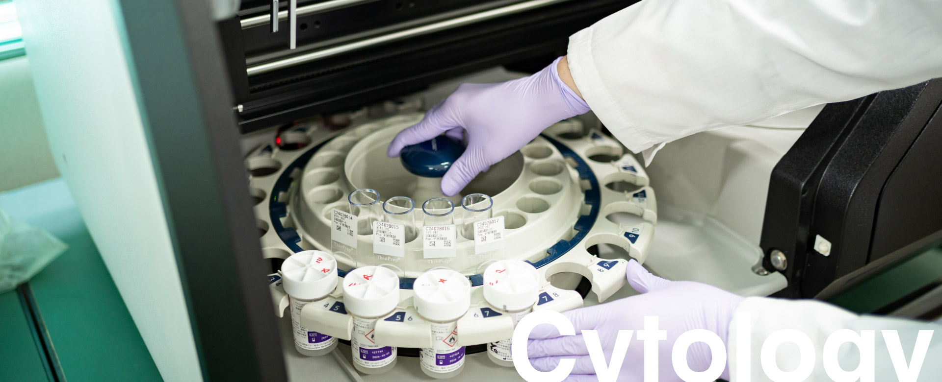 当検査室では、検査精度向上の為、全標本において100%スクリニーングを行っています。(医療関連サービス適合基準では全標本の10%のスクリニーングで適合します。) 細胞学的判定にはきれいな標本を作製する事が何よりも重要で、患者様から提出して頂いた検体を迅速に、塗抹・固定・染色・封入などの工程を経て検鏡します。標本作製には様々な注意を要する点があり、担当の臨床検査技師が日々努力しています。